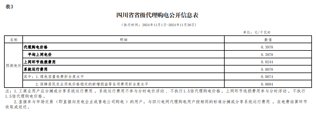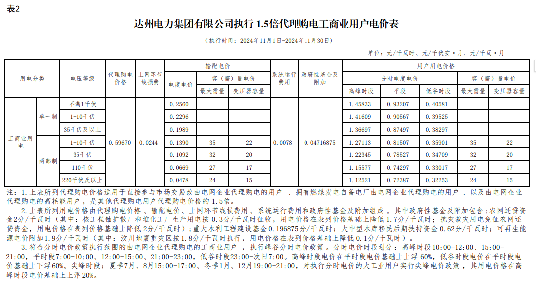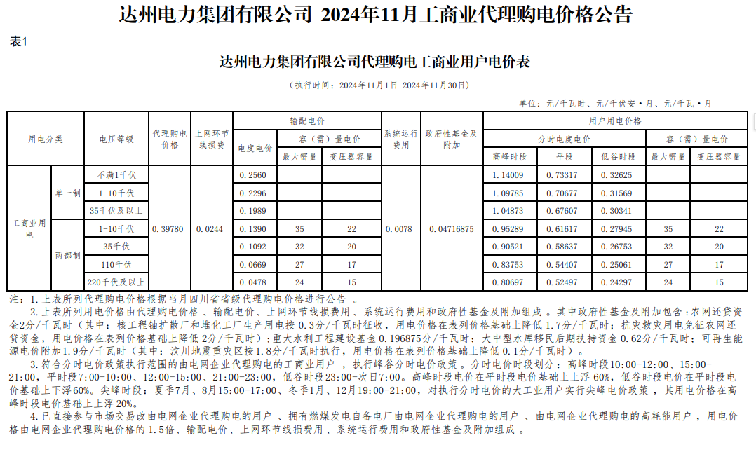 乐动网页版页面登录集团有限公司2024年11月工商业代理购电价格公告
