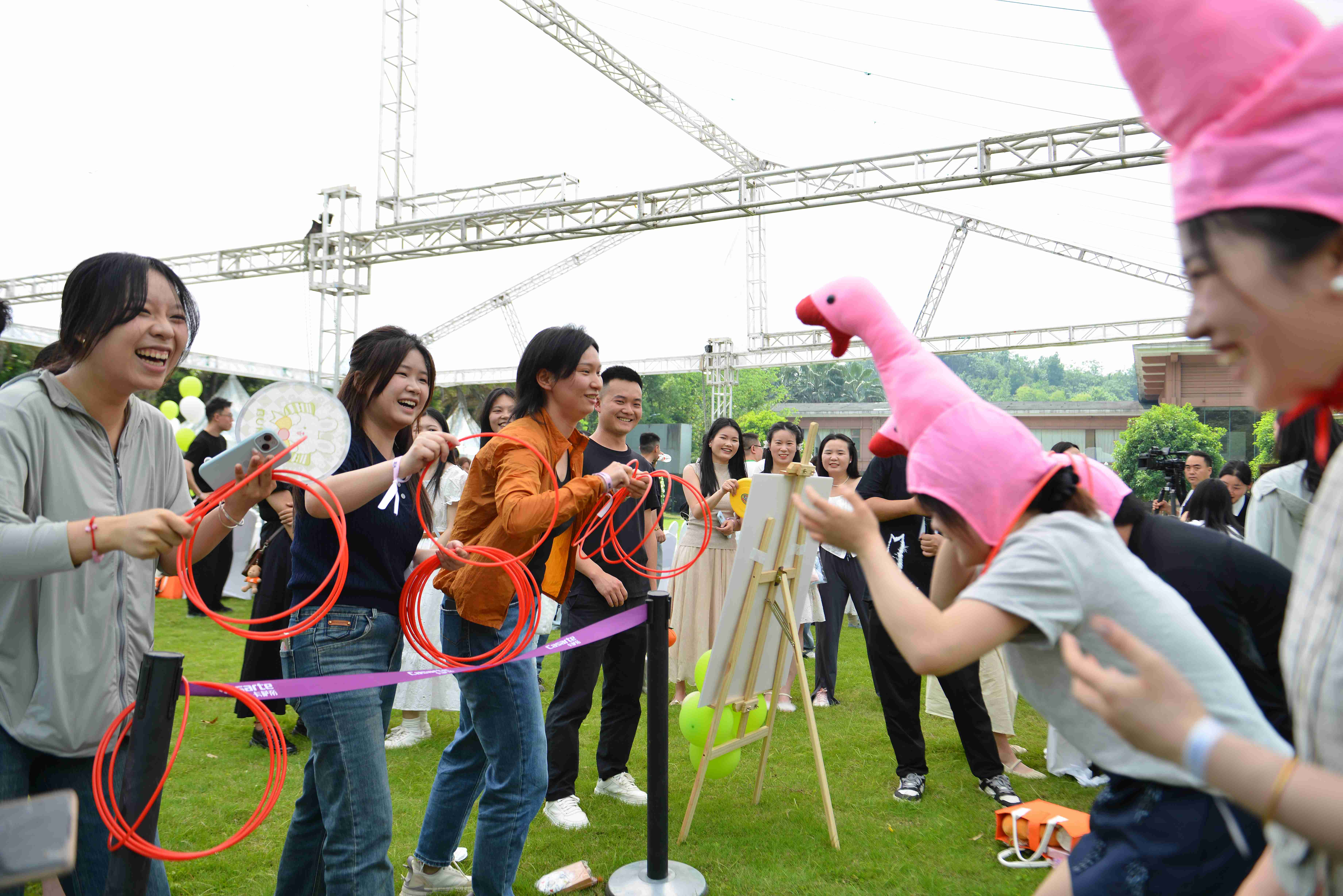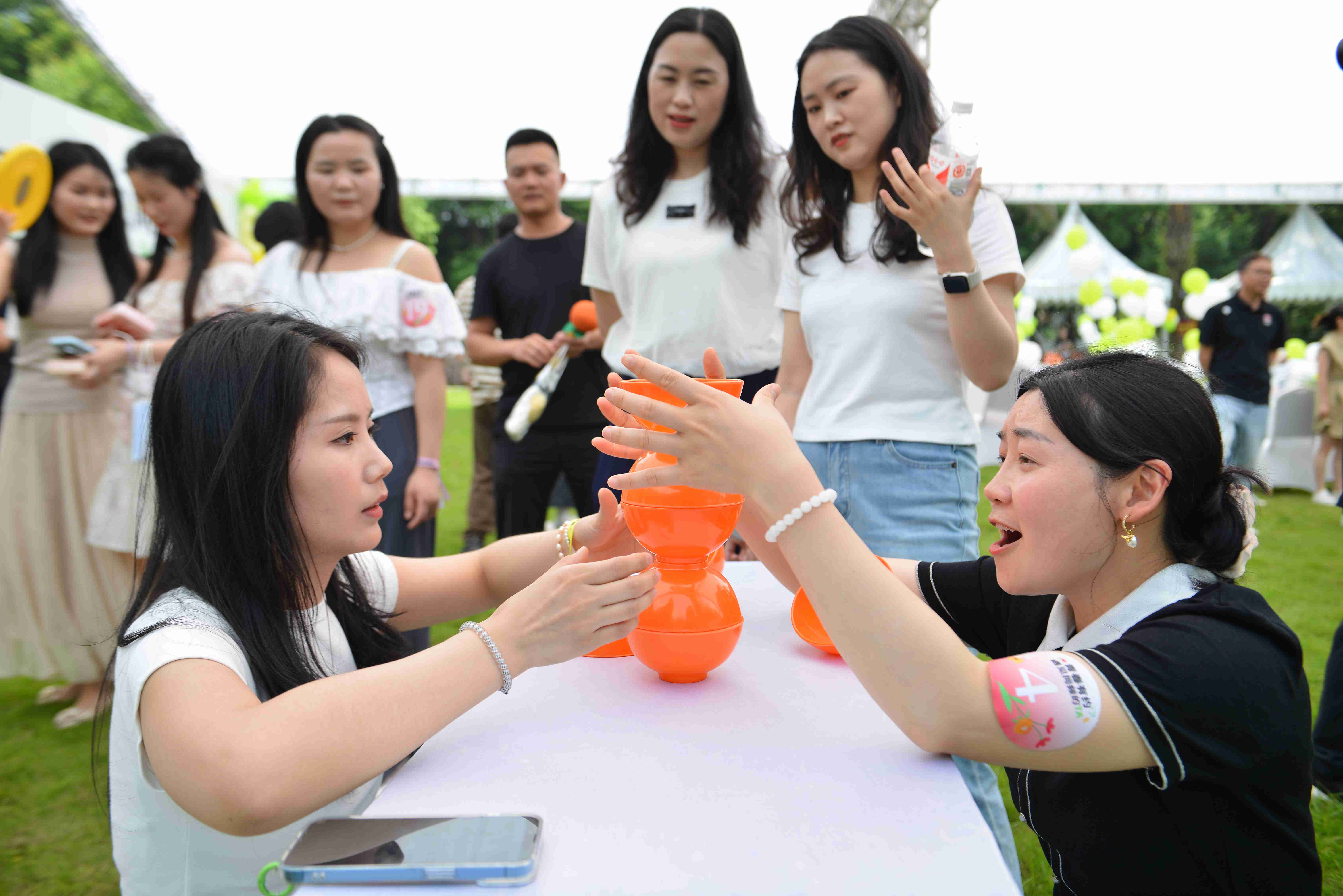 在“默契培养”游戏环节中,通过快问快答、击鼓传花、心有灵犀等互动,青年们逐渐打破初识的羞涩。随后的自由游园活动将氛围推向高潮,双人飞盘、趣味射箭、叠杯挑战等合作游戏让嘉宾在默契配合中增进了解,欢声笑语不断。