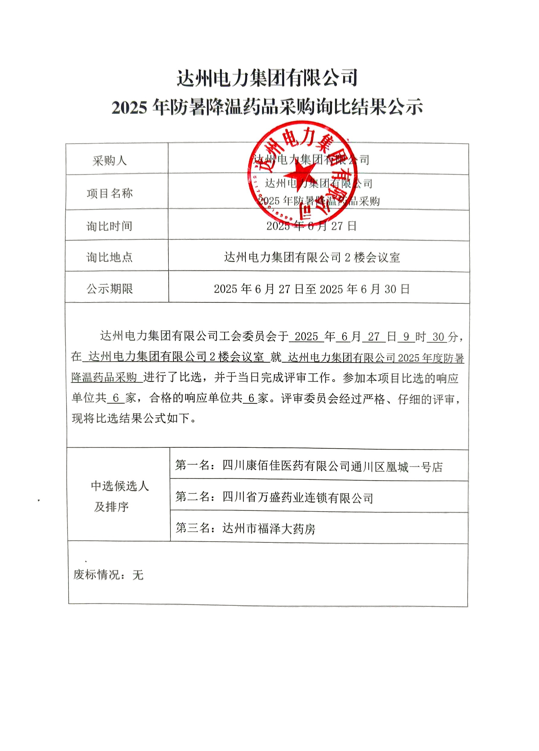 乐动网页版页面登录集团有限公司2025年防暑降温药品采购询比结果公示