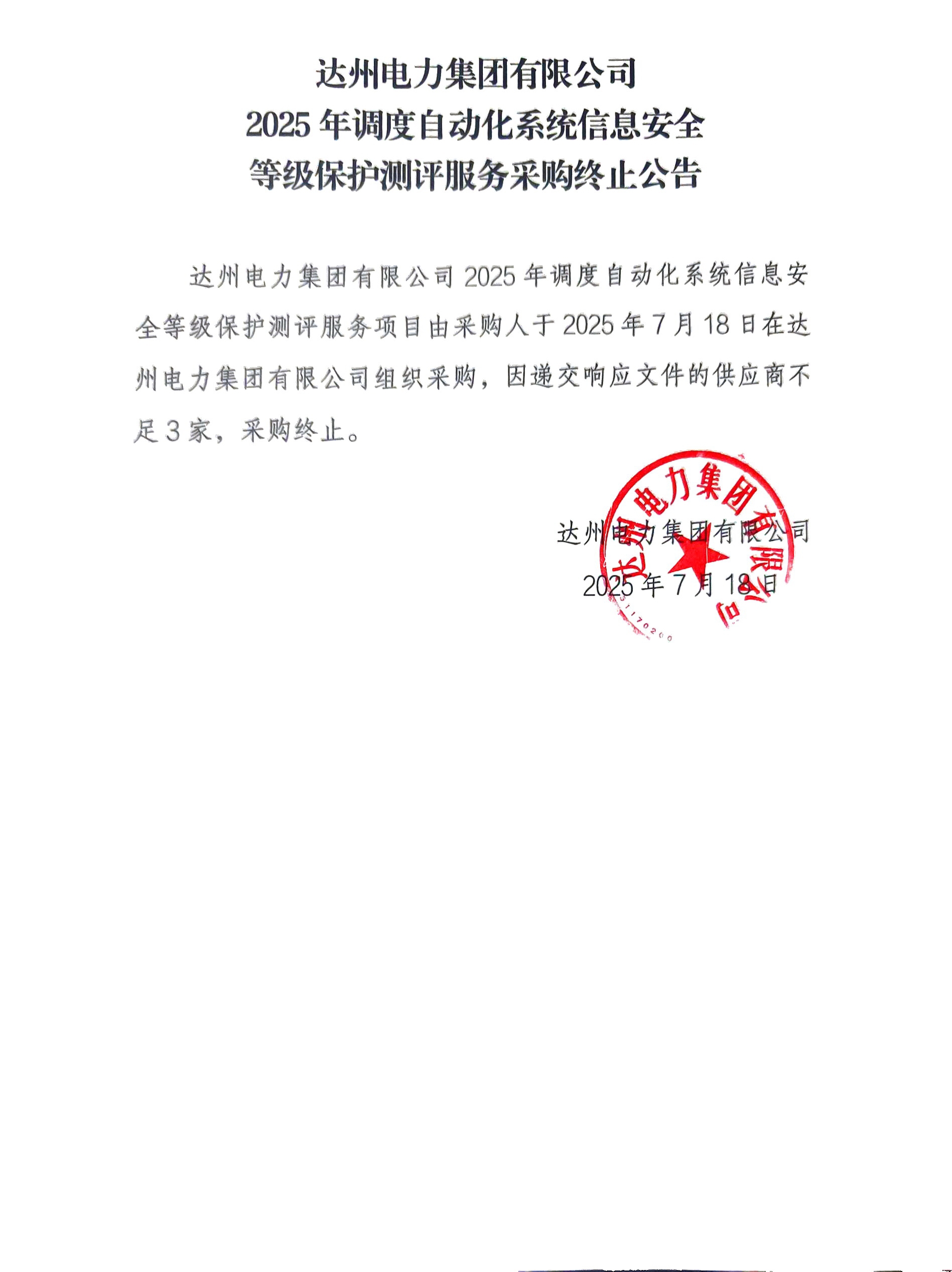 乐动网页版页面登录集团有限公司2025年调度自动化系统信息安全等级保护测评服务采购终止公告